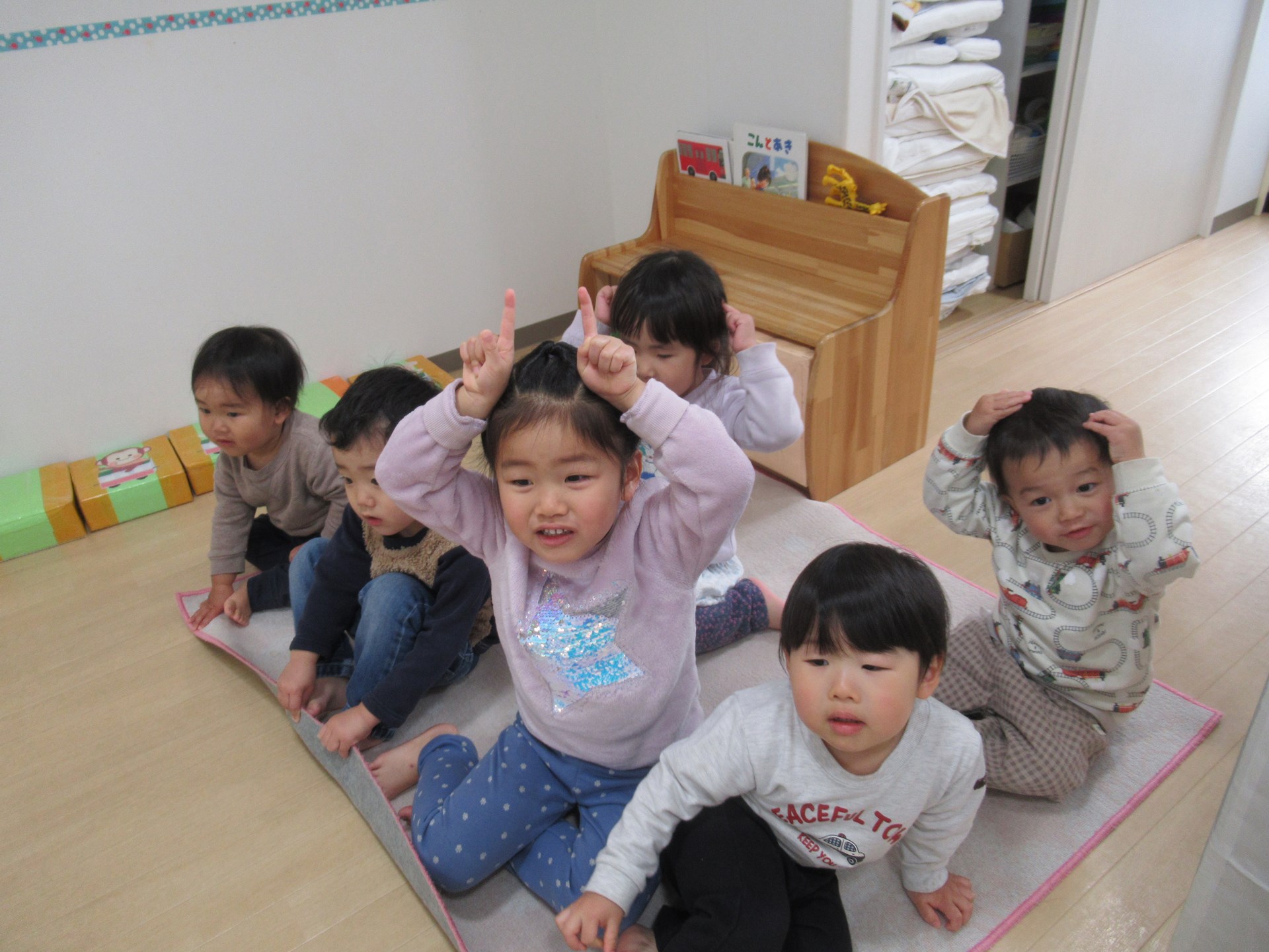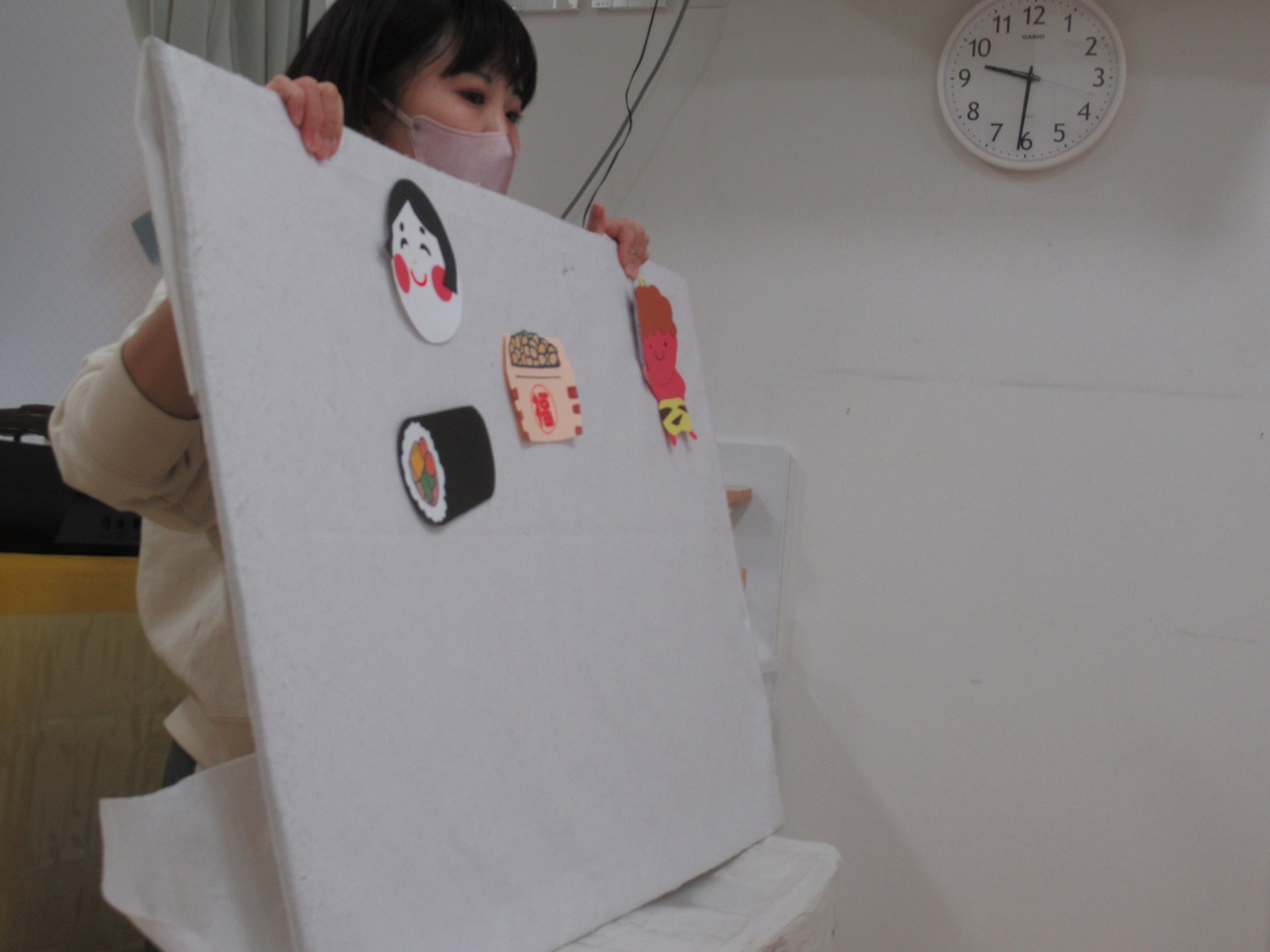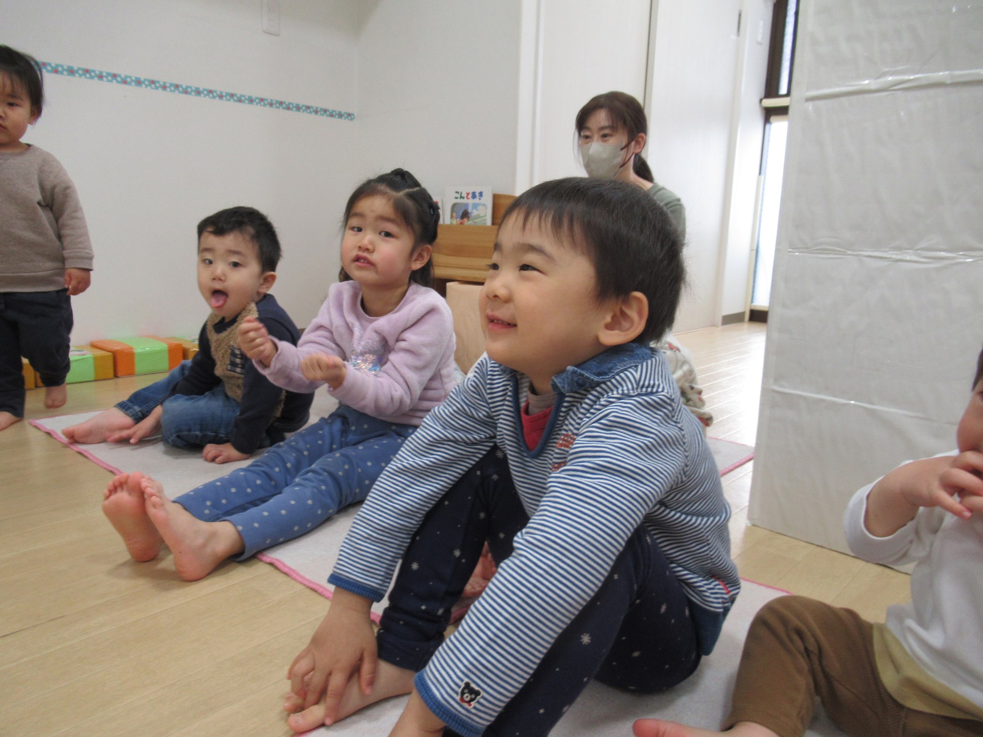 パネルシアターで節分のお話を真剣に聞く子どもたち。