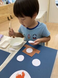 1歳児さん、2歳児さんでお月見の制作をしました!!