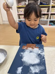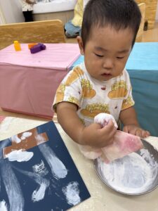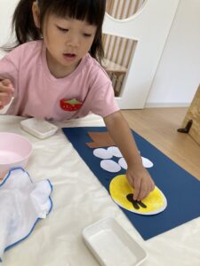 2歳児さんは、月を絵の具で塗ったりうさぎさんをのりを使って付けました🐰