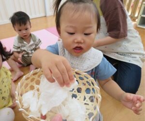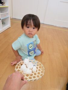 お団子「ぎゅぎゅ」と握ってお団子を作りです。先生の真似っこをして上手ににぎにぎ!!