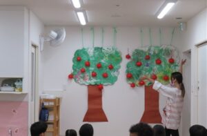 さっそく2歳さんが中心になってぶどうやりんごの木、じゃがいもなどを作り始めました。