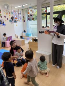 おばけの手遊びをすると、手をお化けの形にして真似っこする姿も見られましたよ。👻