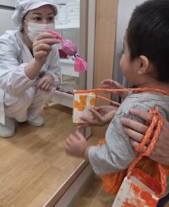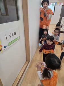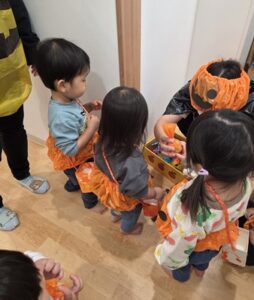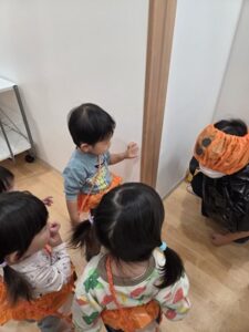 保育園に帰ってくると次は、園内にあるドアをノックして「トリック オア トリート~」
