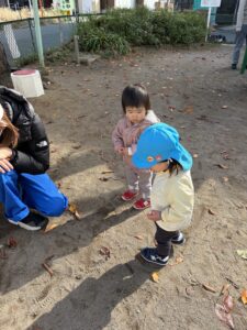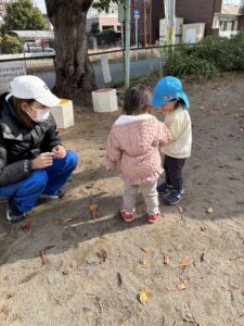 🦔おさんぽ会🍁 2025-11-20 ブログ こんにちは😊 本日、おさんぽ会がありました🎵 参加してくれたお友達と1歳児さんで 泉町公園へ行ってきました! 木の実を見つけて・・・✨ お友達と一緒に木の実探しをして 遊びました🍂 一緒におさんぽできて楽しかったね😊💕 一覧表示に戻る