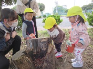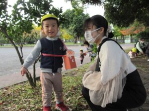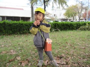 自分たちでつくったどんぐりバッグを持って落ち葉やどんぐりを拾ったり、たくさん走って遊びました🌟