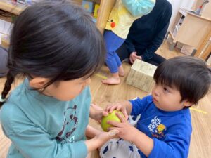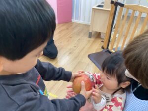 2歳児クラスの子たちは、年下の子に優しく手渡していました。