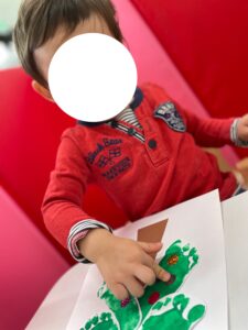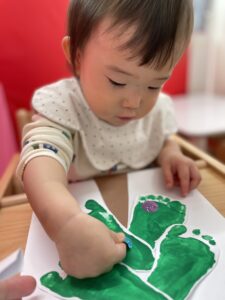 先日は絵の具を使ってスタンプをしたり、シール貼りをしたりしました!