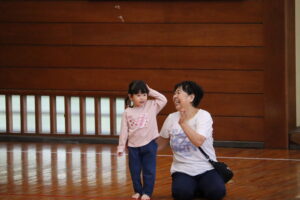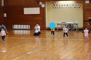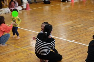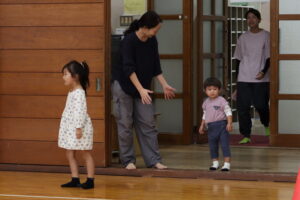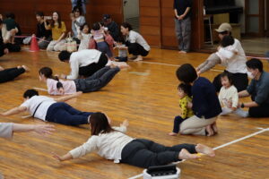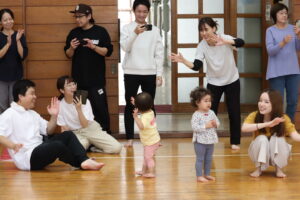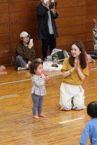 次は1歳児クラスの体操「バナナくん体操」と「オオカミさん」です!こちらも普段の保育で行っている遊びをみんなで行いました!
