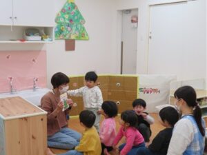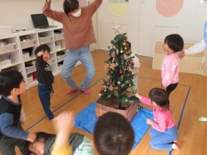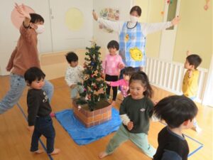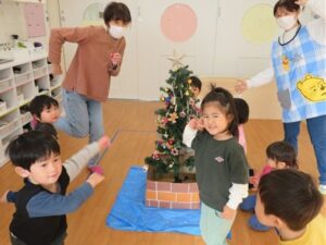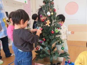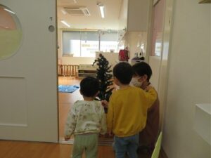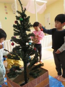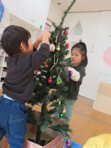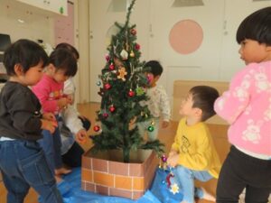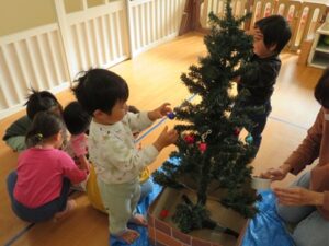 12月に入り2歳児さんがクリスマスツリーの飾りつけをしました