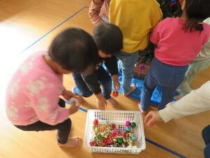キラキラ飾り、かわいい飾り、自分たちで好きなのを選んでもみの木に飾っていきました