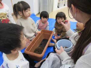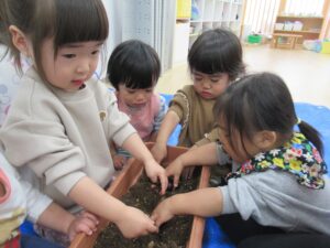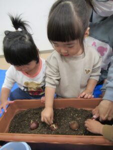 球根を触ってみたり、球根に土のお布団をかけてあげました😉