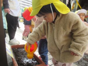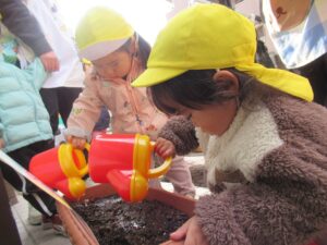お水もたっぷりあげました!「何色のお花が咲くかな〜」「お水ごくごく飲んでるね〜」
