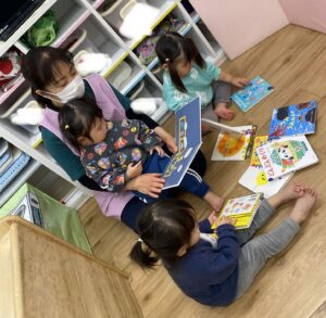 絵本コーナーでみんなで絵本を読んだりして、