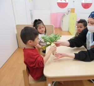 大根を触ってみたり、匂いを嗅いだり、重くてびっくりしていました!!