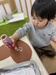 そらぐみ(1歳児)さんで、ハートのチョコにハートスタンプをしました💛