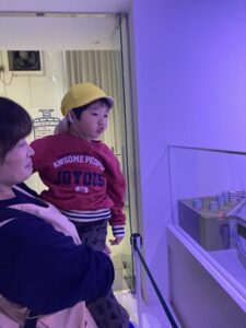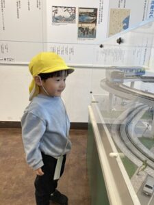 館員の方に「こんにちは」と挨拶をし、近くにあった動くジオラマの所にトコトコとむかい、じーっと見ている姿が😊