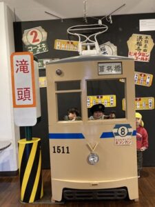 「次は市電保存館~次は市電保存館~」と保育士が用意した降車ボタンを押すと市電保存館に到着!