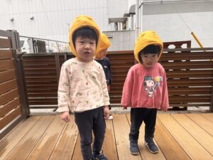 その後、防災頭巾を被り、避難靴を履き、テラスに避難しました。