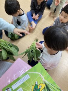 食育「ほうれんそう」 2026-02-25 ブログ 今日は、ほうれん草の食育をしました💚💚 実際にほうれん草に触れると「柔らかい~!」「はっぱ!」と各々の感想を教えてくれましたよ⭐ 給食にほうれん草が出ると挑戦する姿が見られました👀💓 次は、食育はなにかな?楽しみですね✨ 一覧表示に戻る