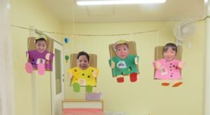 ブランコに乗って風を切って素敵な未来へ!!!!という願いを込めてのり、ハサミを使い製作しました。