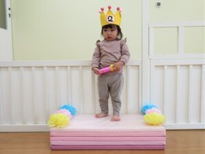 はずかしそうにしながらも前に出て冠をかぶってニコニコです!
