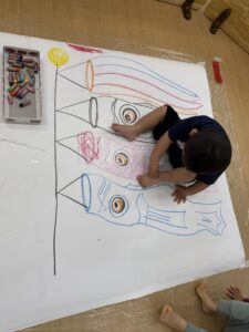 5月に子どもの日があるので、画用紙にこいのぼりを描くと