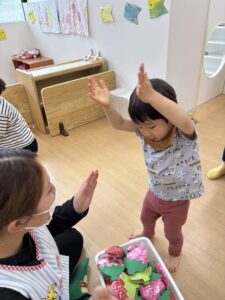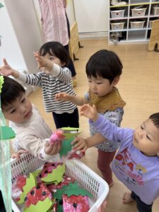 保育者が、「美味しそうないちごだ!」とかごに入れていると