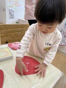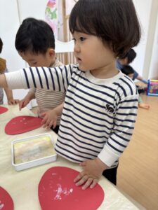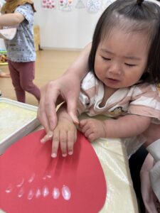 0歳児さんのお友だちも初めての絵の具にドキドキしながらも