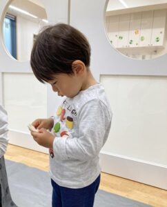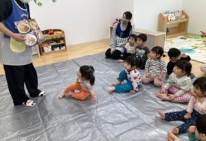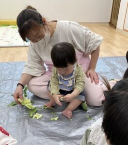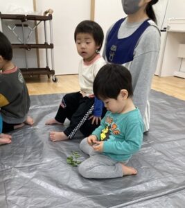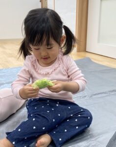 ばなな組(1歳児)さんは、恐る恐る触ったり、小さくちぎってじっくり観察していました。