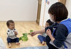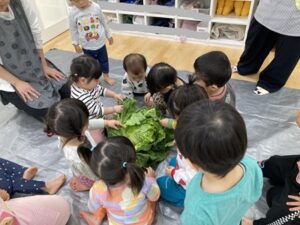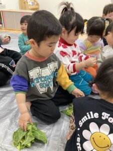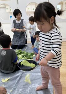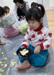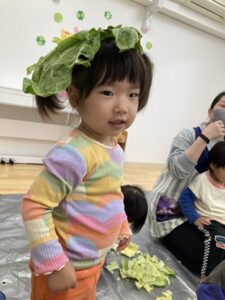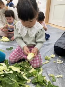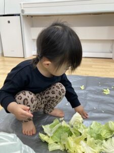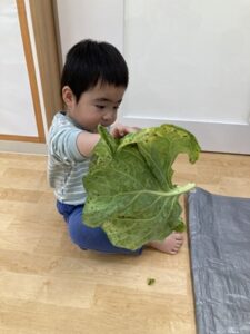 りんご組(2歳児)さんは、頭に乗せたり、ままごとのフライパンで料理したり、ちぎったキャベツを並べたりして楽しんでいました。